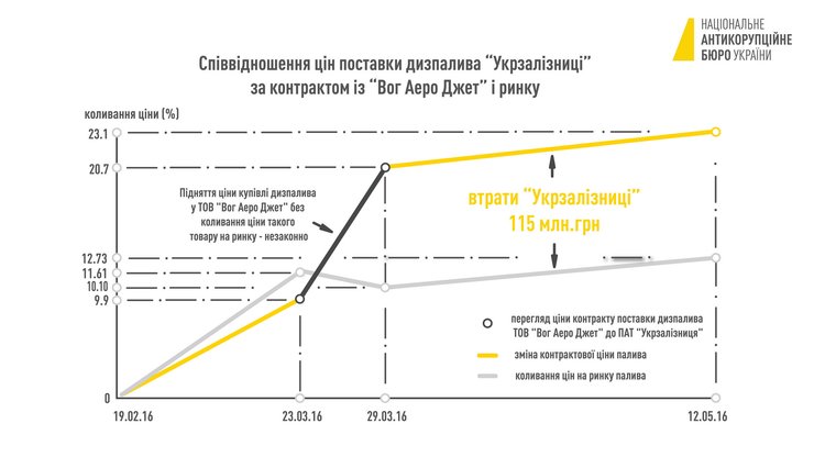 По данным следствия, в результате махинаций с документами Укрзализниця переплатила за дизтопливо 92 млн грн. Как утверждают детективы НАБУ, эти махинации привели к тому, что в дальнейшем предприятие переплатило 22 млн грн.