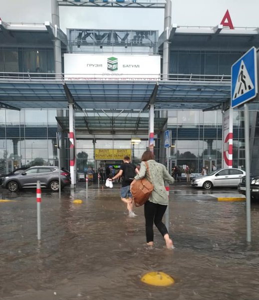 Привокзальная площадь перед терминалами A и D в аэропорту Жуляны оказалась полностью затоплена после сильнейшего ливня в Киеве, свидетельствуют фотографии очевидцев.