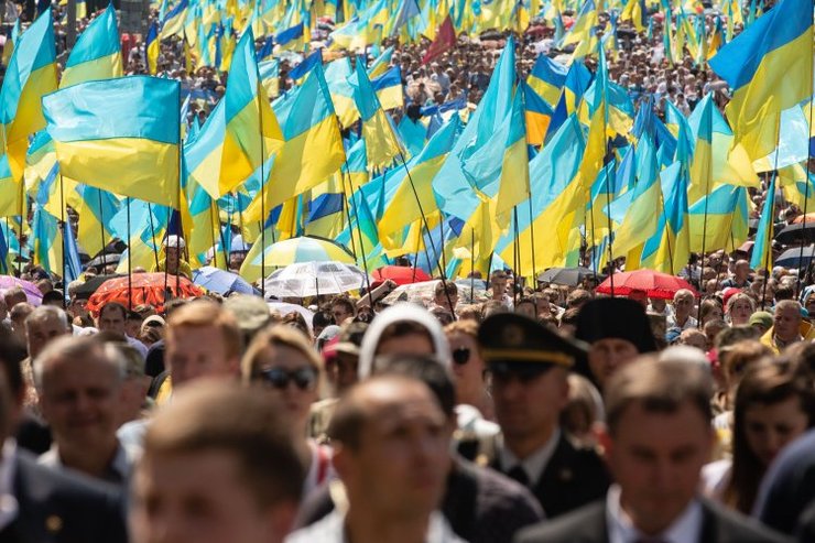Главная часть колонны уже давно прибыла на Владимирскую горку для молебна, а люди все шли и шли. Флагов было настолько много, что мероприятие чем-то напомнило Майдан в его пиковые моменты.