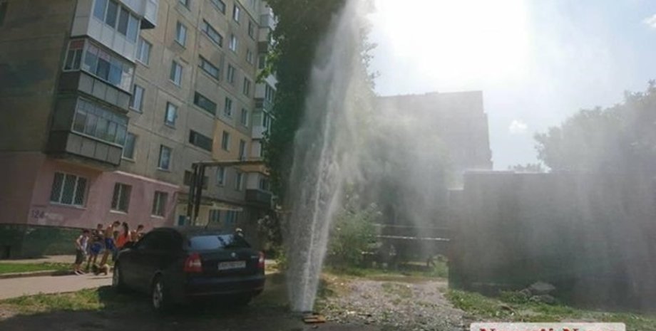 В одном из дворов в Николаеве произошел прорыв водопровода, в результате которого из-под земли стал бить фонтан, достигающий уровня 6 этажа.