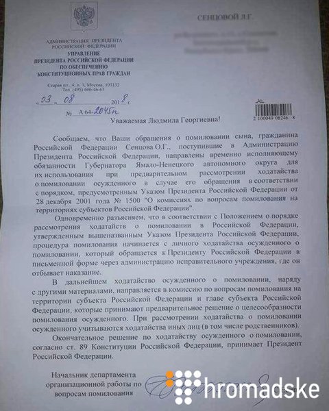 Украинский режиссер Олег Сенцов, незаконно осужденный в РФ, должен сам попросить о помиловании для начала соответствующей процедуры. Об этом говорится в ответе матери политзаключенного Людмиле Сенцовой от Управления по обеспечению конституционных прав граждан при Администрации президента РФ, передает Громадське.