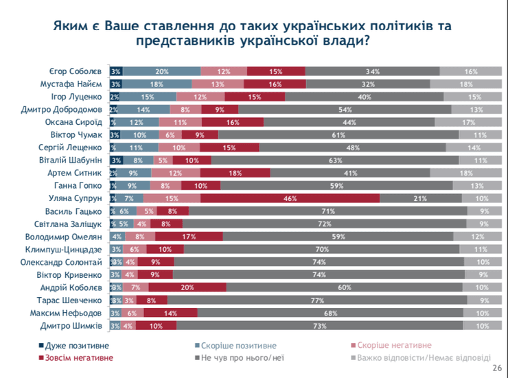 В антирейтинг попал 21 политик и чиновник. Возглавила список Ульяна Супрун, к которой свое негативное отношение выразили почти 46% опрошенных.