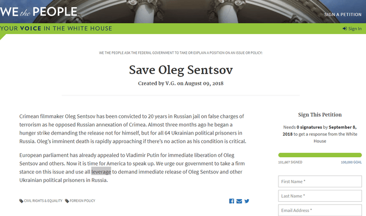 Петиция "Спасите Олега Сенцова" набрала на сайте американского Белого дома необходимые 100 тысяч подписей. Под обращением подписались более 101 000 человек.