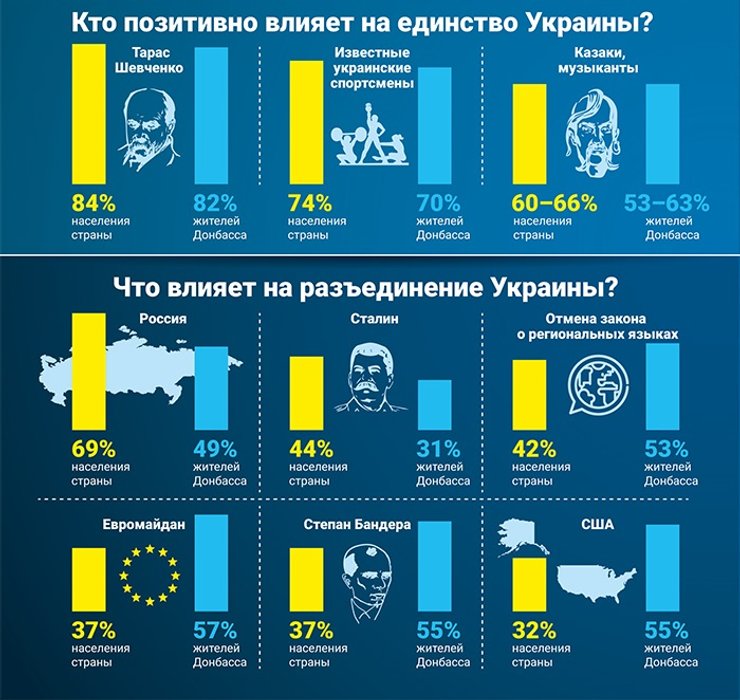 По заказу объедения украинских аналитиков "Кальмиусская группа" исследовательская компания GfK Ukraine провела социологический опрос, чтобы выяснить, чем отличается менталитет жителей Донбасса от менталитета остальных украинцев. Выяснилось, что по основным позициям население страны придерживается практически одинаковых точек зрения вне зависимости от региона проживания, но по некоторым вопросам у жителей Донбасса кардинально другое мнение. К примеру, если в целом в Украине считается, что Россия — первопричина раздора внутри страны, то большая часть населения Донбасса во всем винит Евромайдан. Отличается и восприятие Европы в разных регионах: на Донбассе с опаской относятся ко всему западному, в то время как жители других областей чувствуют близость к европейской культуре. Впрочем, всех украинских граждан способны объединить Тарас Шевченко, Богдан Хмельницкий и гордость за выдающихся спортсменов.