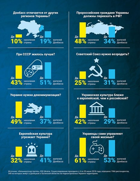 По основным позициям население страны придерживается практически одинаковых точек зрения вне зависимости от региона проживания, но по некоторым вопросам у жителей Донбасса кардинально другое мнение