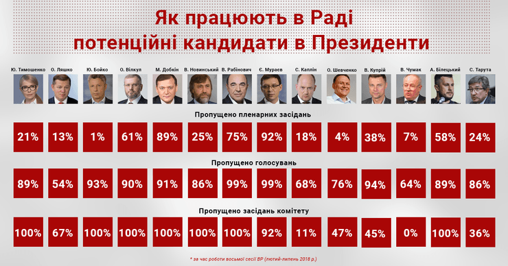 Также Тимошенко, Бойко, Вилкул, Добкин, Новинский, Рабинович и А. Белецкий пропустили все заседания комитетов, в которых они состоят. Ни одного заседания не пропустил только Чумак.