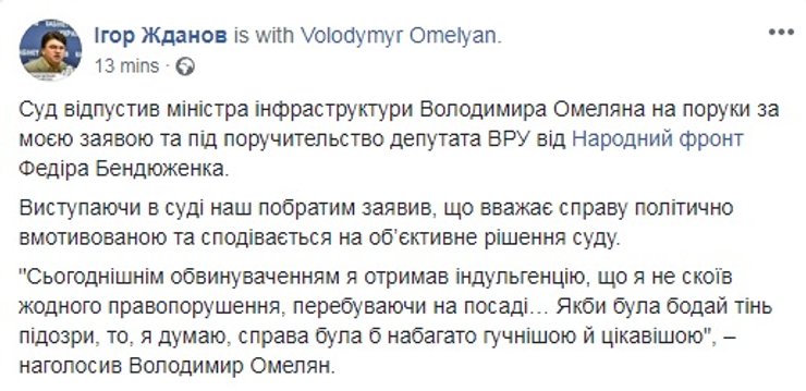 Министра инфраструктуры Украины Владимира Омеляна отпустили на поруки, но обязали "сдать на хранение в соответствующий орган государственной власти паспорта гражданина Украины для выезда за границу и другие документы, дающие право выезда из Украины и въезда в Украину". Поручились за Омеляна министр молодежи и спорта Игорь Жданов и народный депутат Федор Бендюженко (член фракции политической партии "Народный фронт").