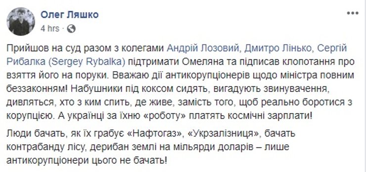 Поручителей обязали "обеспечить выполнение подозреваемым обязанностей, а именно: приезжать к детективам НАБУ по первому требованию, сообщать об изменении своего места жительства или места работы ", – отметила судья Анна Сергиенко. Также Омеляну запретили общаться с рядом свидетелей по его делу.