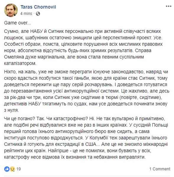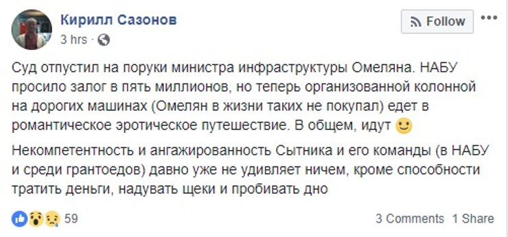 Во время заседания Владимир Омелян сравнил все происходящее с охотой: "То, что сейчас происходит, – это охота. Это мне напоминает борьбу с бабушками в подземных переходах. Потому что когда раскрадывают миллиарды, десятки миллиардов, а делается все, чтобы испортить репутацию министра и показать, что он не достоин своей должности, а придут другие и наведут порядок – это дорога в никуда. В первую очередь – для НАБУ".