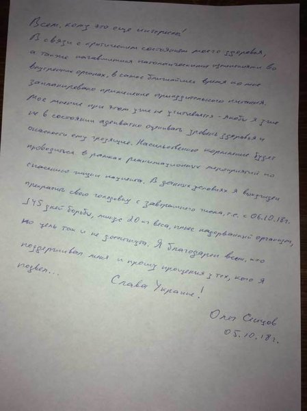 Насильственное кормление будет проводиться в рамках реанимационных мероприятий по спасению жизни пациента. В данных условиях я вынужден прекратить свою голодовку с завтрашнего числа, т.е. с 06.10.18 г.