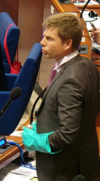 Украинский депутат пришел на заседание ПАСЕ в перчатках сантехника