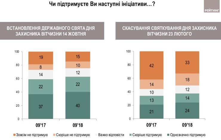 В то же время 62% опрошенных поддерживают идею установления государственного праздника Дня защитника Украину 14 октября (25% - не поддерживают). При этом число сторонников нового праздников больше всего на Западе, а противников отмены советского праздника - на Юге и Востоке.