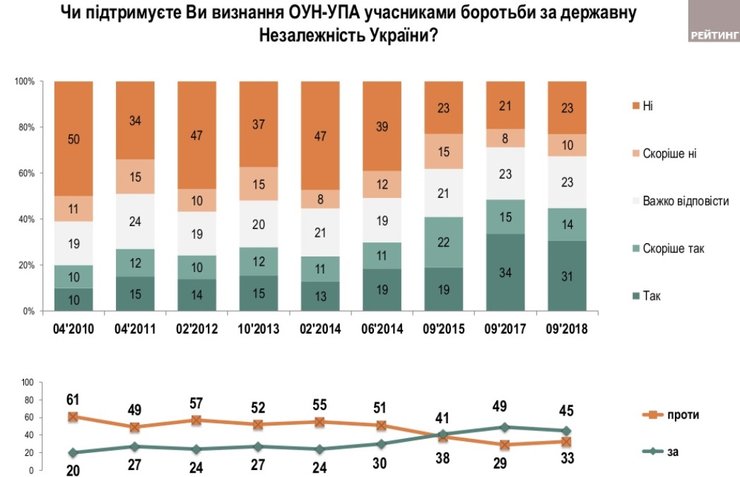 Также 45% опрошенных поддерживают идею признания ОУН-УПА участниками борьбы за государственную независимость Украины (в 2017 - 49%). Треть имеют противоположное мнение, почти четверть затруднились ответить. С начала исследований в 2010 году уровень поддержки этой инициативы вырос в 2,5 раза.