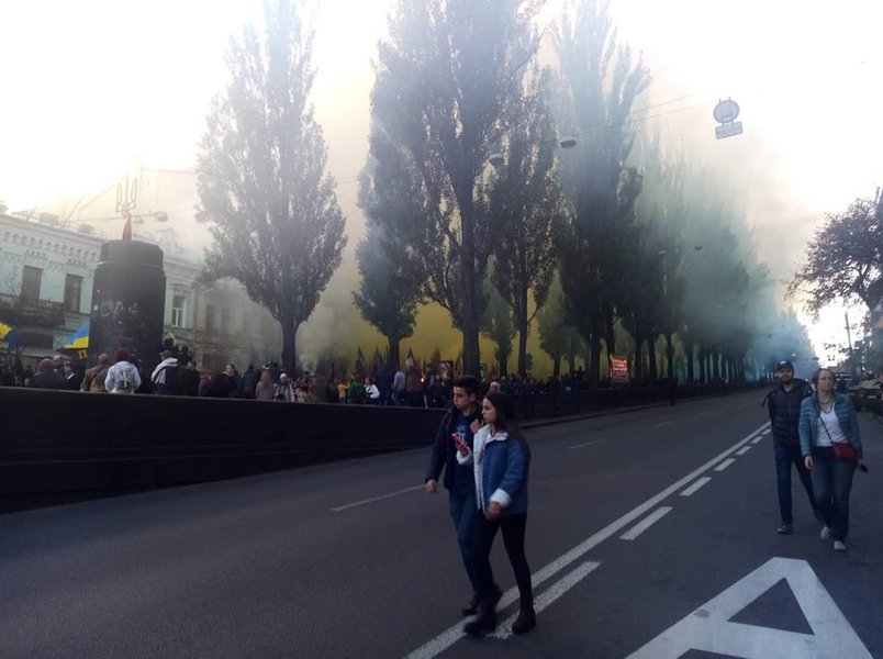 Часть участников марша возле Бессарабской площади зажигали файеры. Участники шествия почтили погибших защитников Украины минутой молчания возле Майдана Незалежности.
