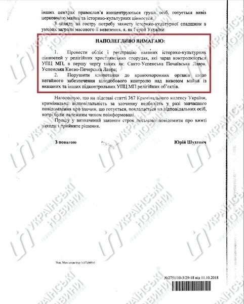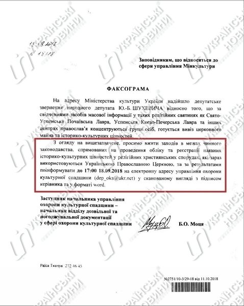 "Учитывая вышеуказанное, просим принять меры в рамках действующего законодательства, направленные на проведение учета и регистрации имеющихся историко-культурных ценностей в религиозных христианских сооружениях, которые сейчас используются Украинской Православной Церковью, и по результатам проинформировать до 17:00 18.09.2018 на электронный адрес управления охраны культурного наследия в отсканированном виде с подписью руководителя и в формате word", - говорится в факсограмме.