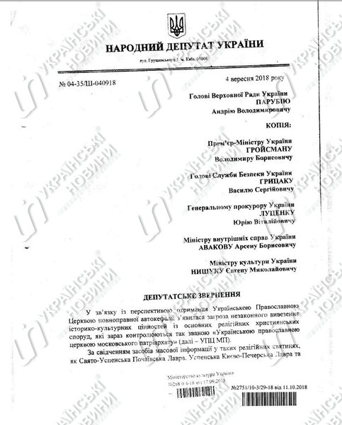 В ответе Минкультуры указано, что данное решение было принято министром Нищуком как реакция на обращение (№04-35/III-040918 от 04.09.2018) депутата Верховной Рады Украины Юрия-Богдана Шухевича относительно возможной угрозы незаконного вывоза культурных ценностей из религиозных сооружений УПЦ МП.
