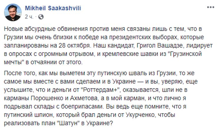 "Новые абсурдные обвинения против меня связаны лишь с тем, что в Грузии мы очень близки к победе на президентских выборах, которые запланированы на 28 октября. Наш кандидат, Григол Вашадзе, лидирует в опросах с огромным отрывом, и кремлевские шавки из "Грузинской мечты" (партии принадлежит большинство в парламенте страны) в отчаянии от этого.