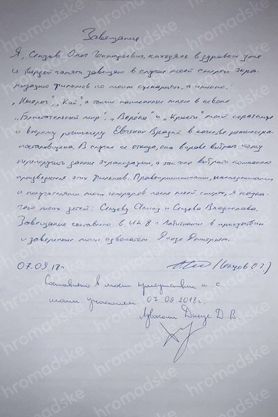"Я, Сенцов Олег Геннадьевич, находясь в здравом уме и твердой памяти завещаю в случае моей смерти экранизацию фильмов по моим сценариям, а именно "Носорог", "Кай", а также написанные мною в неволе "Блистательный мир", "Вороны" и "Кристи" моей соратнице и второму режиссеру Евгении Врадий в качестве режиссера-постановщика. В случае ее отказа, она имеет право выбрать, кому перепоручить эти экранизации, а также выбрать компанию производителя этих фильмов.