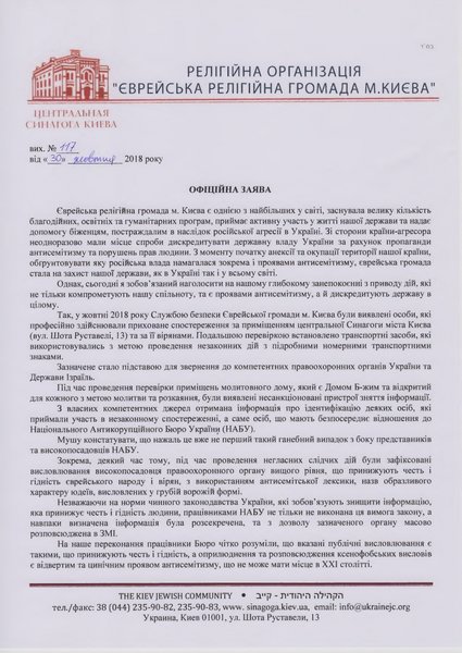 В заявлении утверждается, что в октябре служба безопасности Еврейской общины нашла в помещениях Синагоги "несанкционированные устройства снятия информации". По их данным, их установили лица, "непосредственно имеющие отношение к НАБУ".