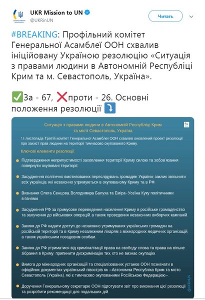 Глава Министерства иностранных дел Украины Павел Климкин заявил в своем Twitter-аккаунте, что в этой резолюции "впервые перечислены имена украинских политических пленников Кремля".