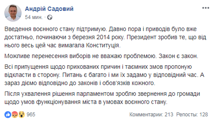 "Все предположения относительно скрытых причин и тайных заговоров (способствующих введению военного положения, - ред.) предлагаю отложить в сторону. Вопросов много и мы их зададим в подходящее время. А сейчас действуем в соответствии с законами и обязанностями каждого", - говорится в сообщении на странице Садового в Facebook.