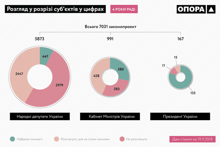 Правительственных законопроектов народными депутатами было поддержано 28 % . Хуже всех дела обстоят у самих парламентариев, - только 12 % их предложений вступили в законную силу.