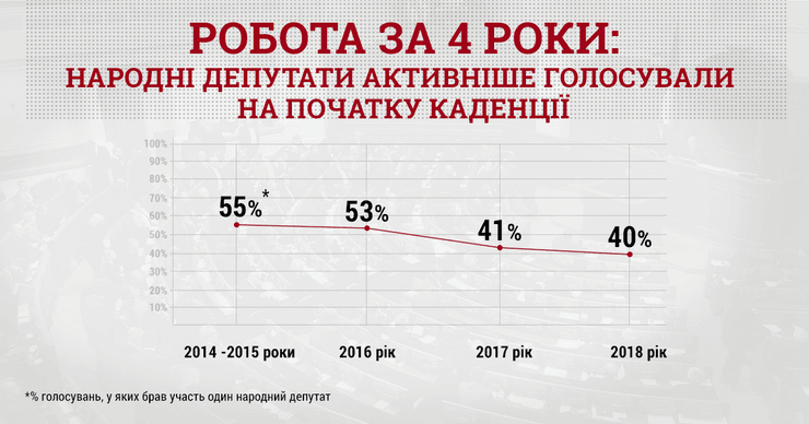 Наиболее активно политики работали в начале каденции. В 2014-2015 году один депутат в среднем участвовал в 55% голосований Совета, в 2016 - в 53%, в 2017 - 41%, в 2018 - лишь в 40%.