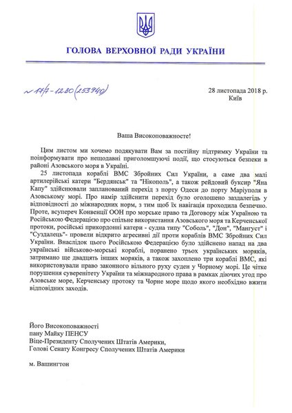 Председатель Верховной Рады Андрей Парубий направил письмо вице-президенту США, председателю Сената Конгресса США Майку Пенсу, в котором призвал к введению новых санкций против РФ после ее агрессии в Керченском проливе.