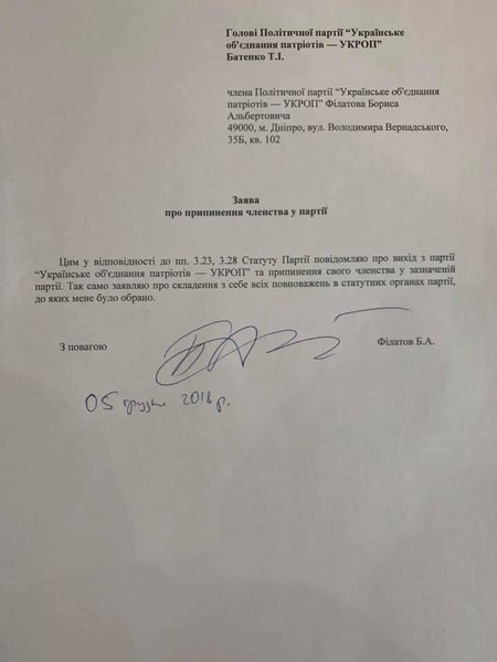 Мэр Днепра Борис Филатов заявил, что покидает политическую партию "Укроп", разместив на своей странице в Facebook заявление о выходе из политсилы.