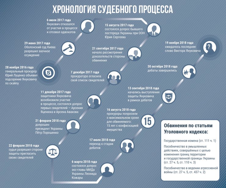 Но первым до суда дошло дело о госизмене Януковича, основанием которого стало обращение к Владимиру Путину с просьбой использовать российские вооруженные силы для "восстановления законности, мира, правопорядка, стабильности и защиты населения Украины".