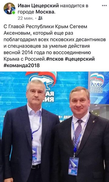 Об этом 8 декабря на своей странице в Facebook сообщил сам Цецерский, разместив совместное фото с Аксеновым. Позже он откорректировал свой пост, убрав из него "слова благодарности", но российское издание "Москвоский комсомолец в Пскове" успело сделать его скриншот.