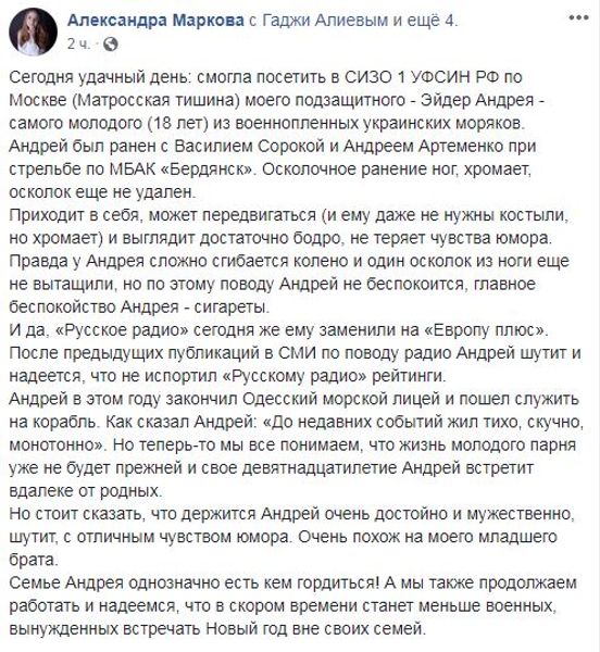 Адвокат Александра Маркова сообщает, что самому молодому 18-летнему украинскому моряку Андрею Эйдеру российские тюремщики заменили по его просьбе "Русское радио" на "Европу плюс".
