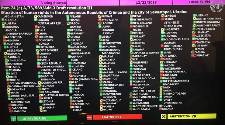 Напомним, 18 декабря Генеральная Ассамблея ООН приняла предложенную Украиной резолюцию о "проблеме милитаризации" Крыма и акваторий Азовского и Черного моря. За документ проголосовали 66 стран, против - 19, воздержались 72.