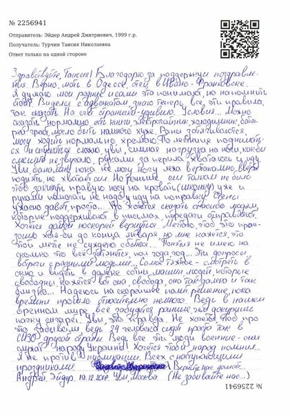 Турчин заметила, что тюремный цензор вымарал два слова в письме Эйдера, угадывается фраза "Слава Украине!"