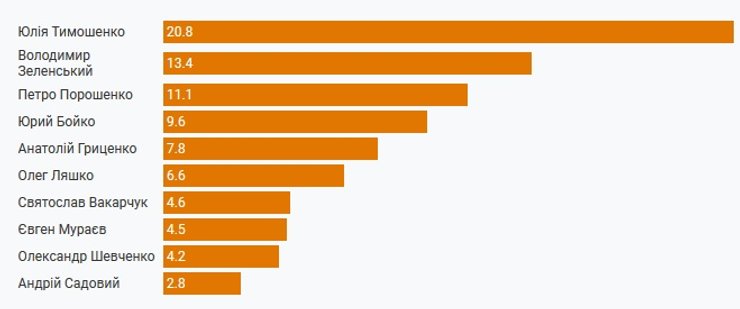 Лидерами президентского рейтинга являются руководитель партии "Батькивщина" Юлия Тимошенко, артист и соучредитель "Студии "Квартал 95" Владимир Зеленский, а также нынешний президент Украины Петр Порошенко. При этом почти треть опрошенных или пока не определились со своими политическими предпочтениями, или не планируют голосовать на выборах.