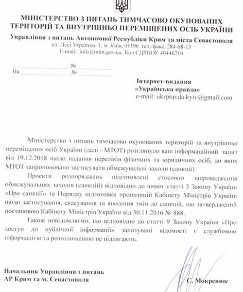 В предыдущем ответе СМИ от МинВОТ говорилось, что распорядителем запрашиваемой информации является Кабмин. Правительство в свою очередь ответило, что не является распорядителем запрашиваемой информации, поэтому направило запрос УП в МинТОТ.