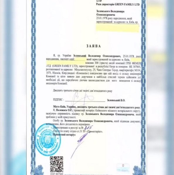 Зеленский показал напечатанное заявление о выходе, в котором указано, что он обладает 300 акциями Green Family LTD.