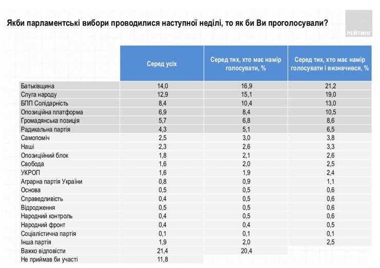 В Верховную Раду сейчас имеют шансы попасть шесть партий: "Батькивщина" (21,2% опрошенных, которые уже определились с выбором и намерены голосовать), "Слуга народа" (19,0%), БПП "Солидарность" (13,0%), Оппозиционная платформа "За жизнь" (10,5%), Гражданская позиция (8,6%), Радикальная партия (6,5%).