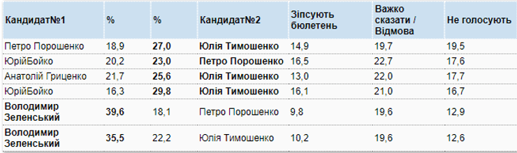 В ходе опроса моделировались также 6 различных пар во втором туре. Зеленский лидирует с большим перевесом в паре с Порошенко (+ 21.5%), и в паре с Тимошенко (+ 13%).