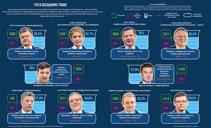 Большинство из 44 текстов предвыборных программ отвечают общепринятым ожиданиям. Выделиться из общей массы смогли только единицы, попытавшись обратить на себя внимание за счет стиля подачи. Однако общая картина такова: редкие примеры конкретных предложений по улучшению жизни страны тонут в потоках "воды": пустые обещания, не подкрепленные деталями по достижению поставленных целей, отличают большинство предвыборных программ. Так, программа семантического анализа текстов "Адвего" фиксирует максимальный показатель "воды" у Олега Ляшко и Владимира Зеленского (по 70%), а минимальный – у Руслана Кошулинского (58,5%).