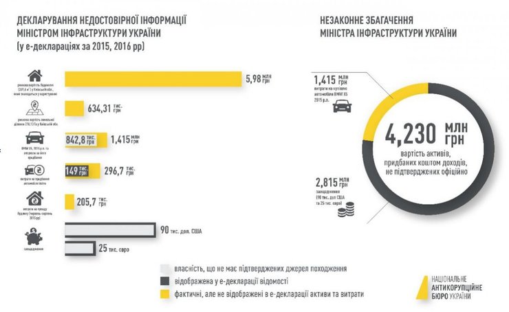- 13 сентября 2018 года, Национальное антикоррупционное бюро сообщило министру инфраструктуры Владимиру Омеляну о подозрении в незаконном обогащении. Министр все обвинения опровергает.
