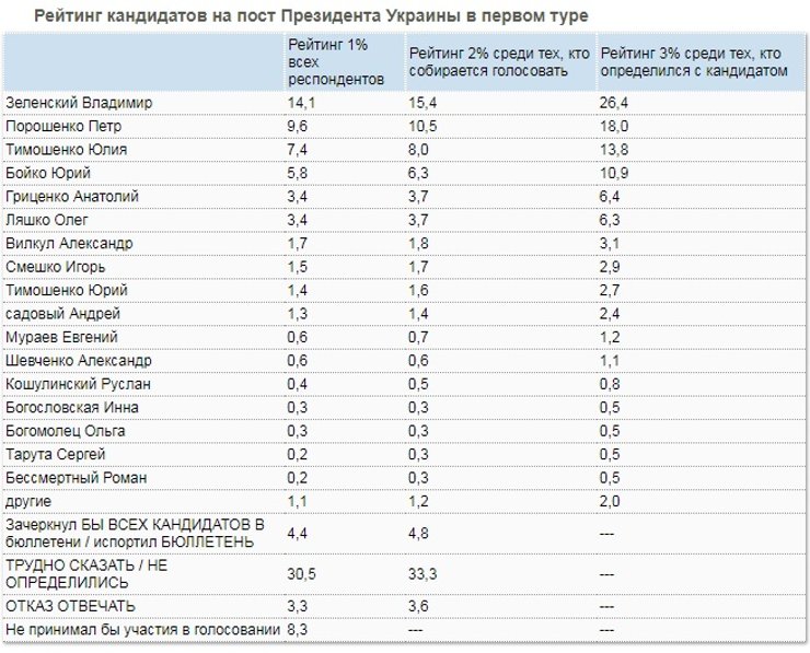 При этом социологи отмечают, что разница в поддержке Порошенко и Тимошенко находится в пределах статистической погрешности. Поэтому наиболее реальными парами во втором туре могут быть Зеленский- Порошенко или Зеленский-Тимошенко, а также сохраняется высокая вероятность пары Порошенко- Тимошенко.