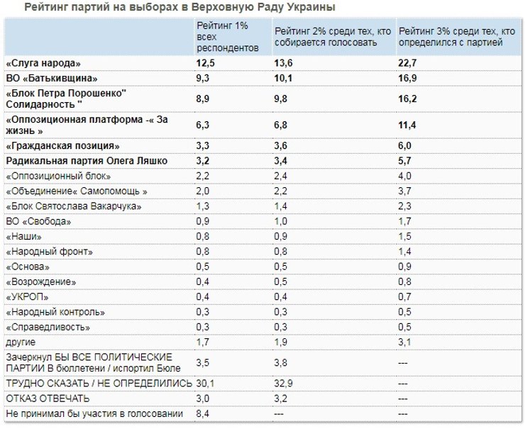 При этом на данный момент в Верховную Раду имеют шансы пройти 6 партий. Из тех, кто уже определился со своим выборов, 22,7% проголосовали бы за партию "Слуга народа", 16,9% - за партию "Всеукраинское объединение "Батькивщина", 16,2% - за партию "Блок Петра Порошенко "Солидарность", 11,4% - за партию "Оппозиционная платформа – "За Жизнь", 6% - за партию "Гражданская позиция", 5,7% - за Радикальная партия Олега Ляшко.