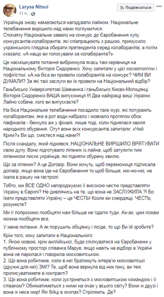 "Сначала Национальное заставило украинского зрителя выбирать претендента среди коллаборационистов, а потом сказало: "А зачем вы голосовали за коллаборанта?".... Чем вы думали? За какие такие заслуги вы их провели на Национальный отбор?", - написала она.