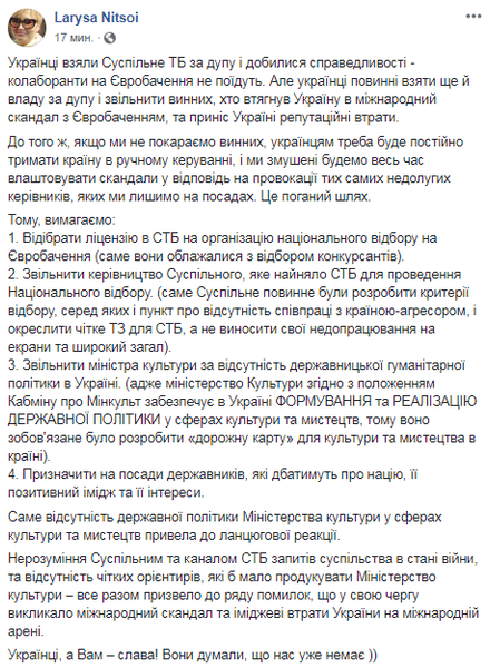 "Требуем отобрать лицензию у СТБ на организацию Нацотбора на Евровидение – именно они облажались с отбором конкурсантов; уволить руководство Общественного, которое наняло СТБ для проведения Нацотбора; уволить министра культуры за отсутствие государственной гуманитарной политики", - заявила Ницой.