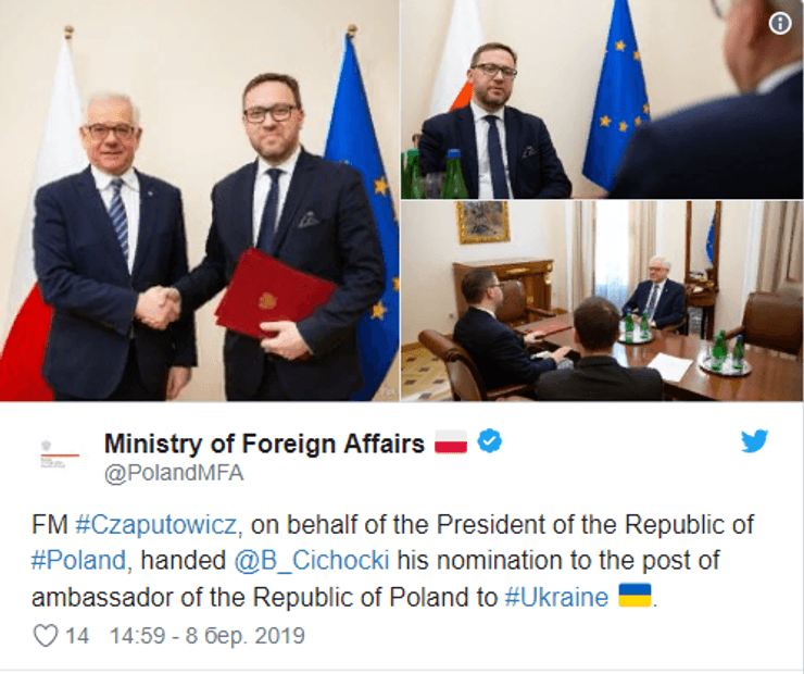 Глава МИД Польши Яцек Чапутович предложил своего заместителя Бартоша Цихоцкого на пост нового посла в Украине.