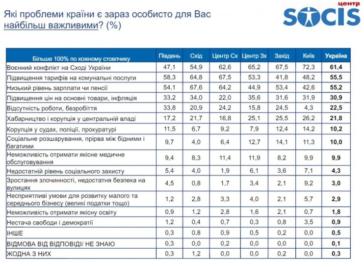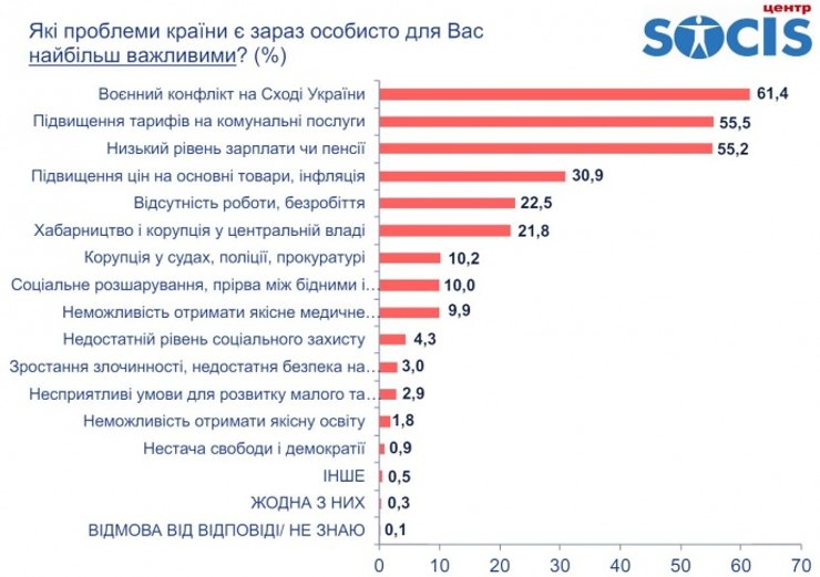 Согласно полученным данным, военный конфликт на Донбассе беспокоит 61,4% украинцев, дорогие коммунальные услуги – 55,5%, низкие зарплаты и пенсии – 55,2%, ростом цен и инфляцией обеспокоены 30,9%. Также 22,5% украинцев считают серьезной проблемой безработицу в стране.