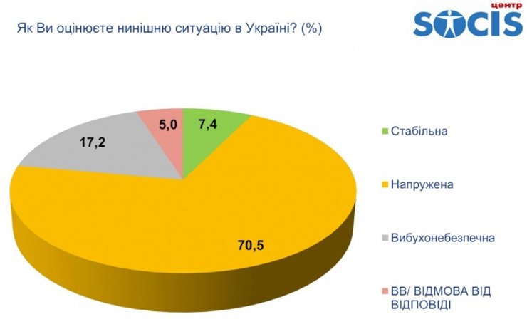 Кроме этого, подавляющее большинство украинцев – 70,5% называют ситуацию в стране напряженной, а еще 17,2% рассматривают ее как взрывоопасную. Последних больше в центральном регионе Украины.