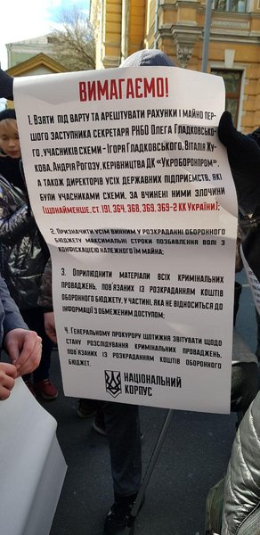 Среди требований протестующих – арест Олега Гладкоского, его сына и других фигурантов скандала о коррупции в Укроборонпроме, обнародование материалов уголовных дел о хищениях в оборонном секторе и еженедельные отчеты генпрокурора о ходе расследования.