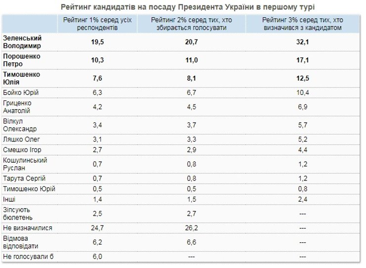 Согласно последнему опросу "Рейтинга", лидером президентского рейтинга остается шоумен Владимир Зеленский, которого поддерживают 24,9% тех, кто определился и намерен голосовать. Вторую позицию занимает лидер "Батькивщины" Юлия Тимошенко (18,8%), третью – действующий глава государства Петр Порошенко (17,4%).